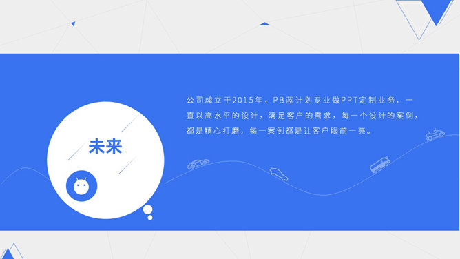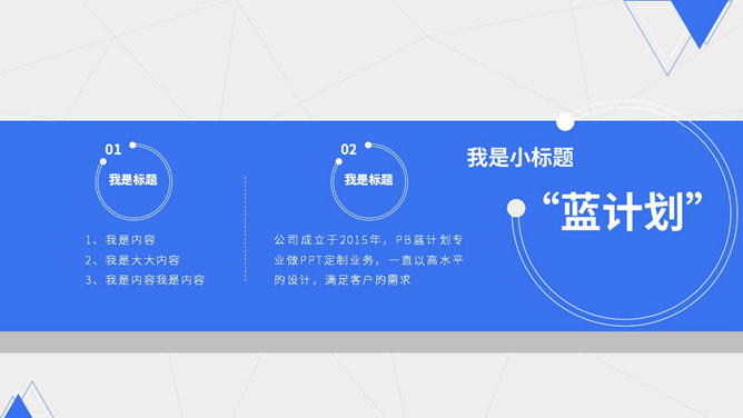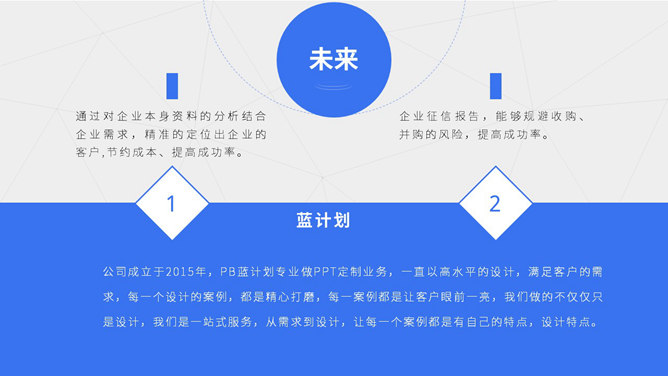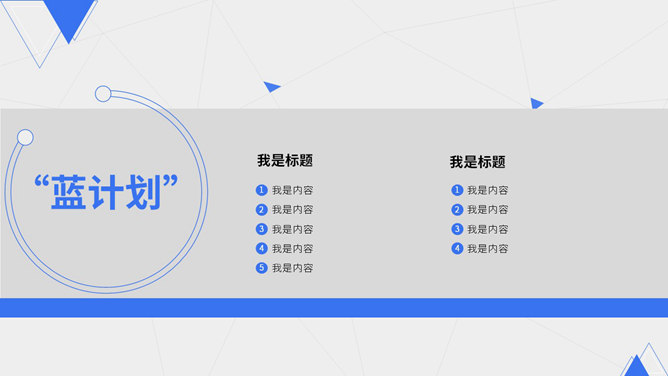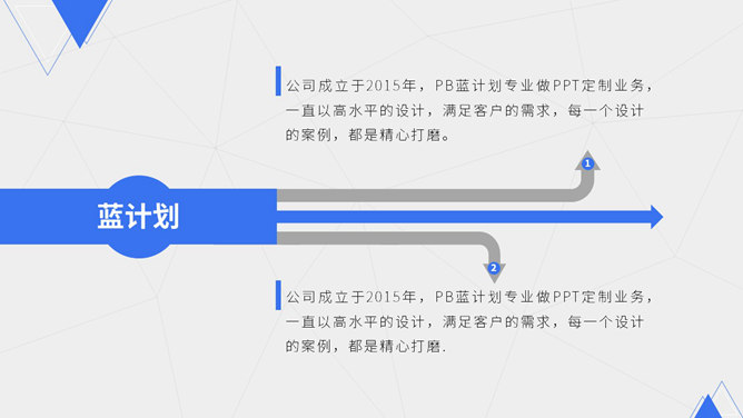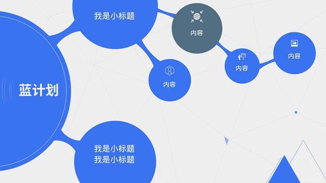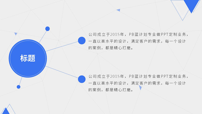 蓝色点线商业计划书PPT模板。一份清爽大气蓝色商业计划书幻灯片模板,采用点线、三角形、圆形等基础图形装饰。使用字体:Noto Sans S Chinese Bold、Noto Sans S Chinese Medium、Noto Sans S Chinese Thin。