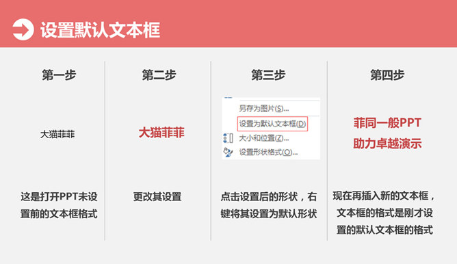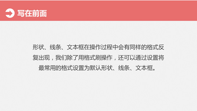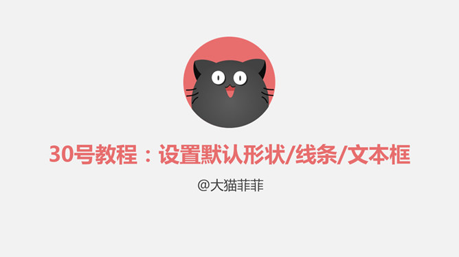 大猫菲菲30号教程:设置默认形状/线条/文本框。形状、线条、文本框在操作过程中会有同样的格式反复出现,我们除了用格式刷操作,还可以通过设置将最常用的格式设置为默认形状、线条、文本框。