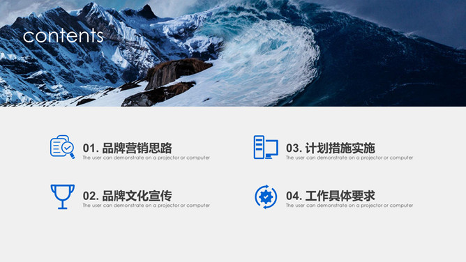 品牌营销计划策划书PPT模板。一套品牌营销策划市场营销计划书模板,大气蓝色主色调,简约大方设计。
