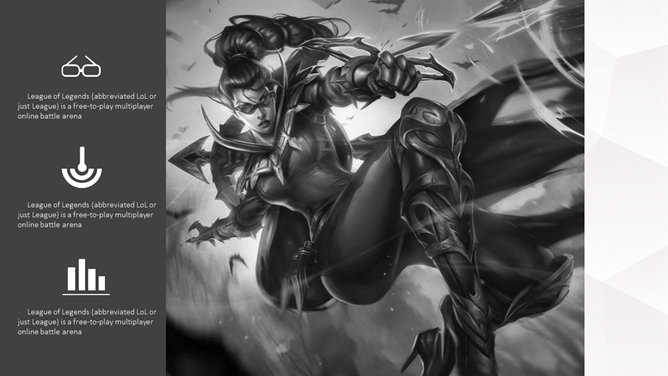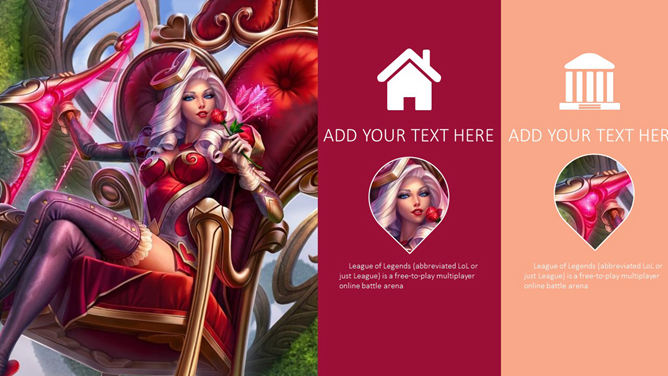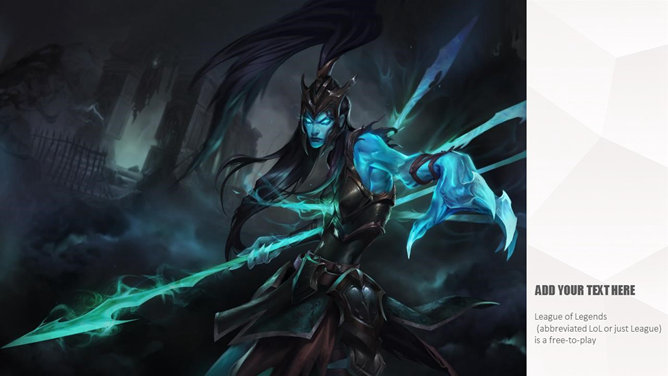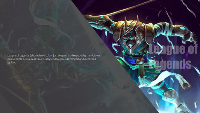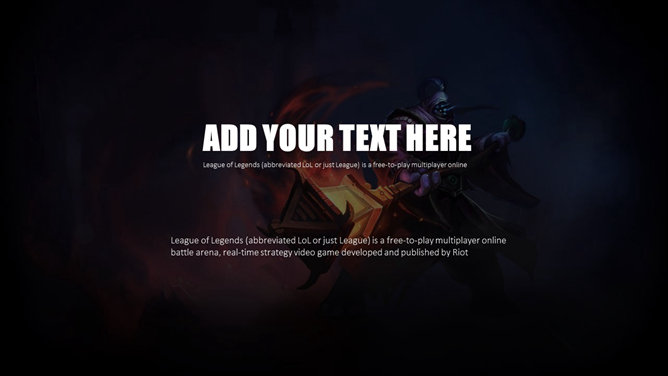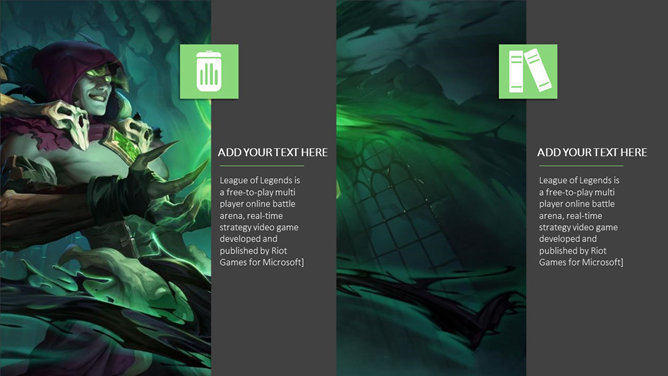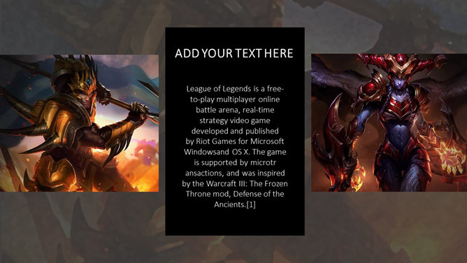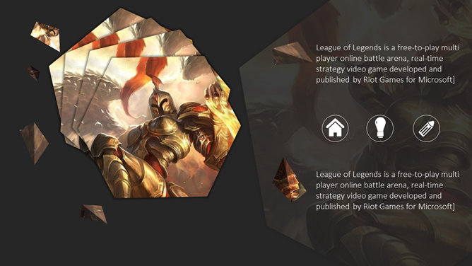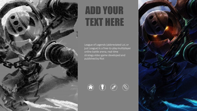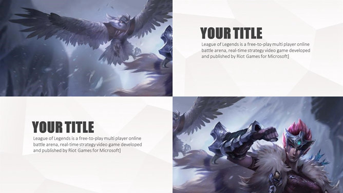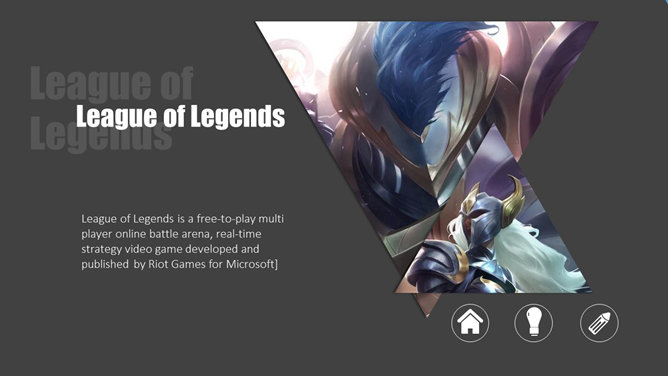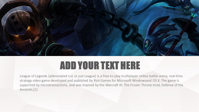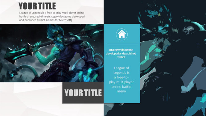 游戏《英雄联盟》主题PPT模板。一份以游戏《英雄联盟》为主题的幻灯片模板。《英雄联盟》(简称lol)是由美国Riot Games开发,中国大陆地区由腾讯游戏运营的网络游戏。LOL已经成为当今世界最具人气和影响力的网络游戏之一。
