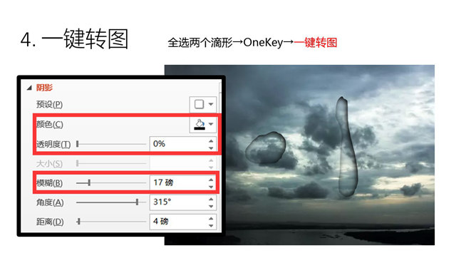 制作逼真雨滴效果PPT教程。步骤:1. 绘制滴形。插入选项卡→形状→任意多边形→按住鼠标左键不放绘制。选中两个滴形右键→设置形状格式→线条→无。2. 形状裁图。先选背景图,再选滴形→OneKey→一键特效→形状裁图。3. 设置阴影。全选滴形右键→设置形状格式→阴影→预设→内部右上角。颜色:黑色→透明度:0→模糊(10版叫虚化):17。4. 一键转图。全选两个滴形→OneKey→一键转图。5. 设置阴影。全选滴形右键→设置形状格式→阴影→预设→内部左下角……