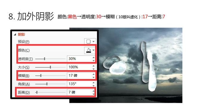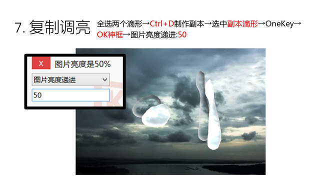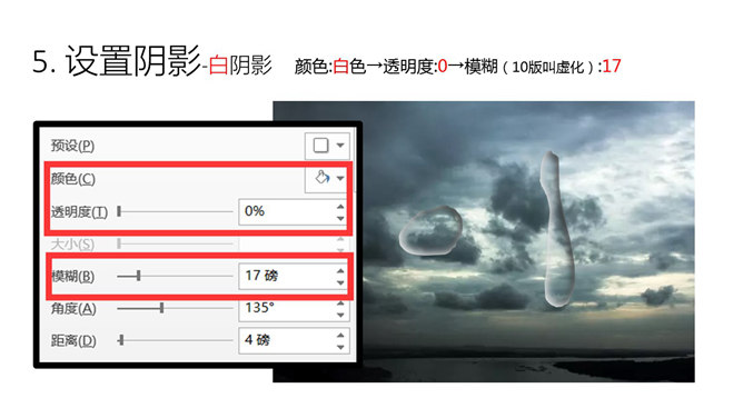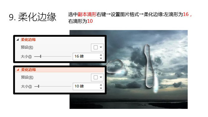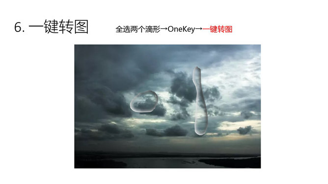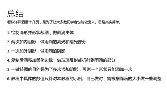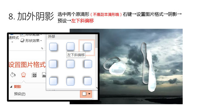 制作逼真雨滴效果PPT教程。步骤:1. 绘制滴形。插入选项卡→形状→任意多边形→按住鼠标左键不放绘制。选中两个滴形右键→设置形状格式→线条→无。2. 形状裁图。先选背景图,再选滴形→OneKey→一键特效→形状裁图。3. 设置阴影。全选滴形右键→设置形状格式→阴影→预设→内部右上角。颜色:黑色→透明度:0→模糊(10版叫虚化):17。4. 一键转图。全选两个滴形→OneKey→一键转图。5. 设置阴影。全选滴形右键→设置形状格式→阴影→预设→内部左下角……