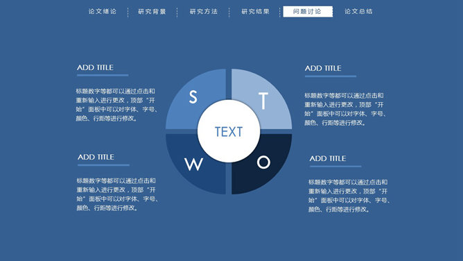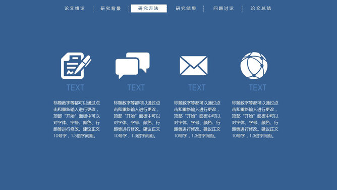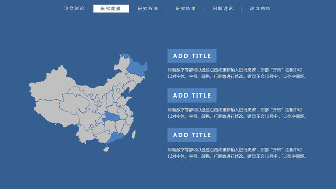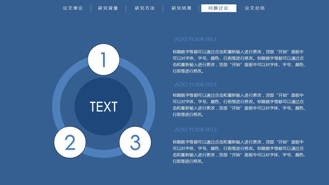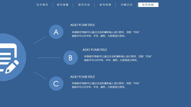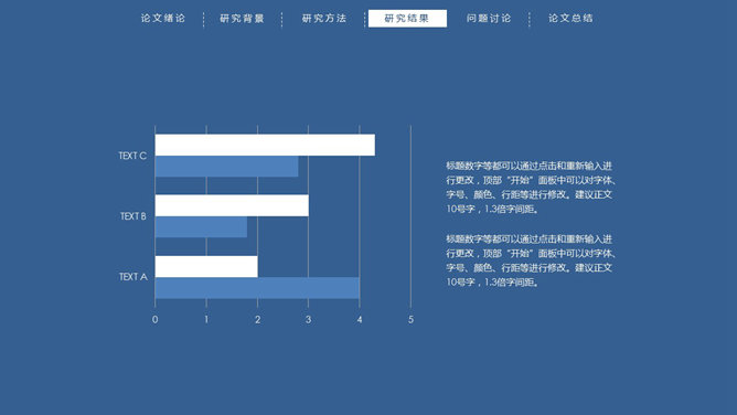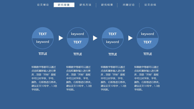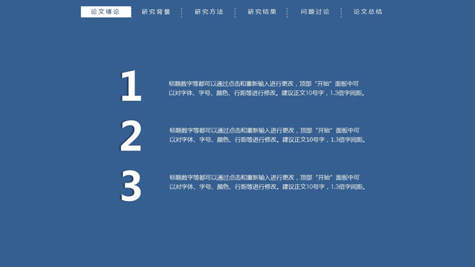 顶部导航简约论文答辩PPT模板。一份简洁大方的毕业设计论文答辩PowerPoint模板,严谨稳重蓝色主色调,页面顶部项目导航。