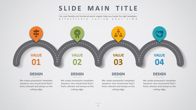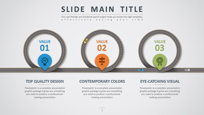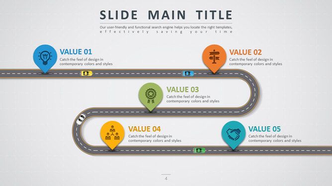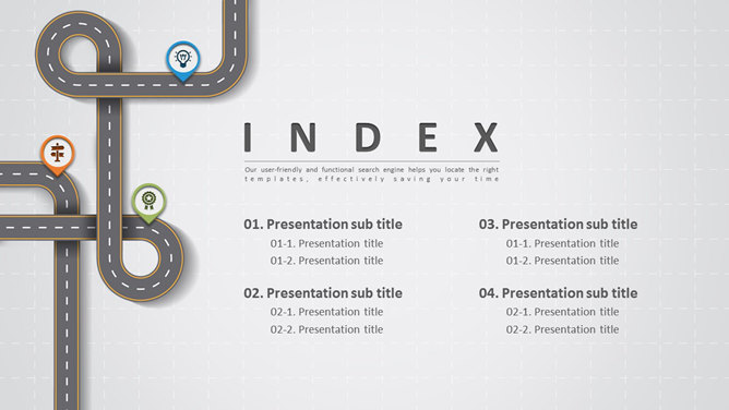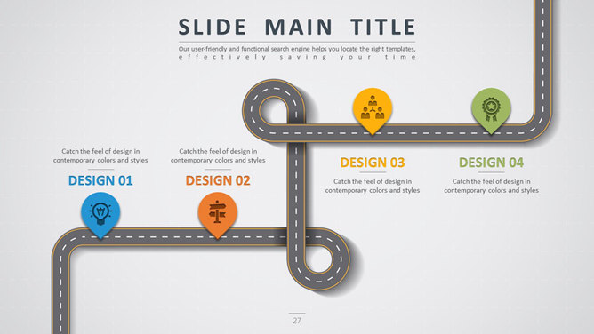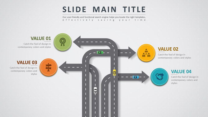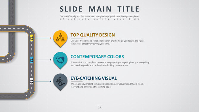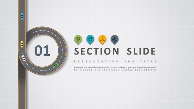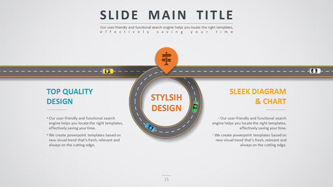 创意公路主题设计PPT模板。一份精美的非常有创意的幻灯片模板,以公路图形为主题元素设计,共30页,页面丰富。
