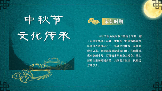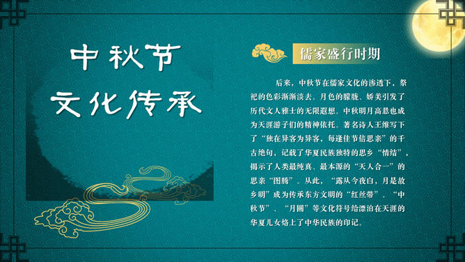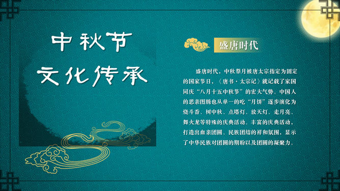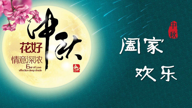 花好月圆中秋节主题PPT模板。一份中秋节主题PowerPoint模板,以中秋圆月和花朵、月饼装饰,象征了花好月圆,介绍了中秋节的起源、传统习俗、文化传承等内容。建议安装字体:方正古隶简体、方正大标宋简体。