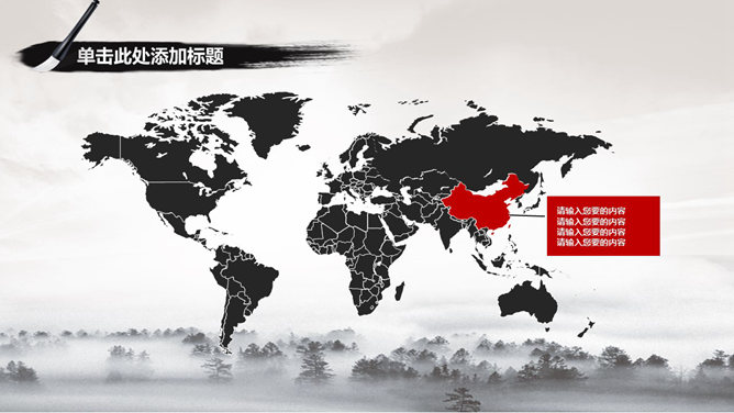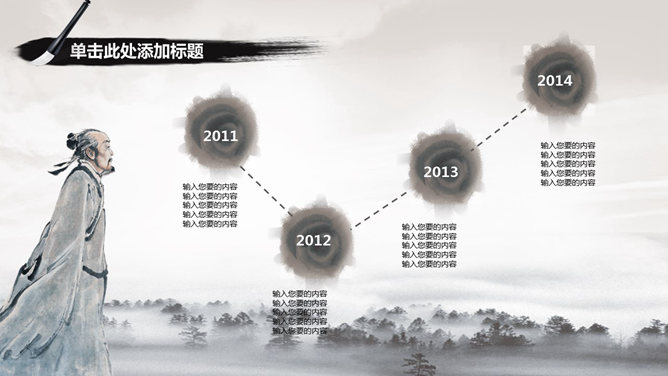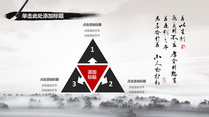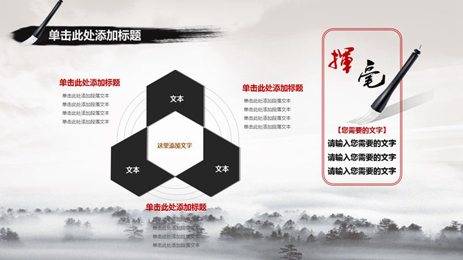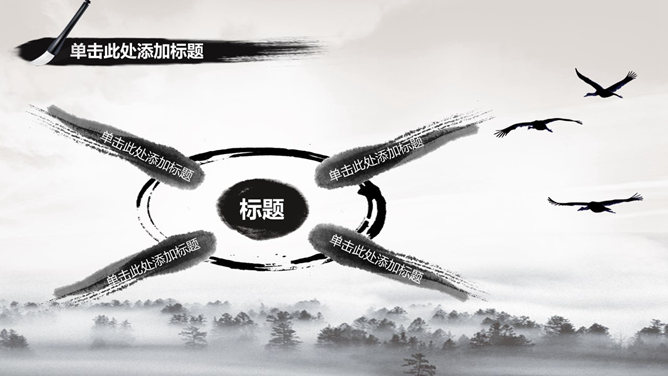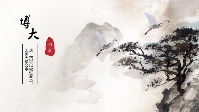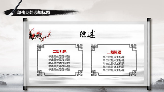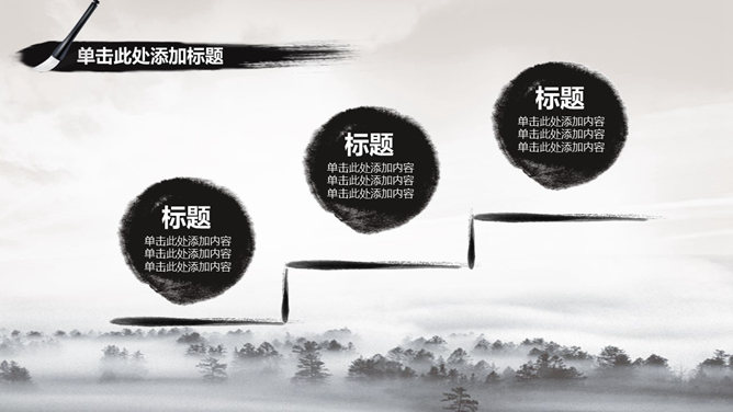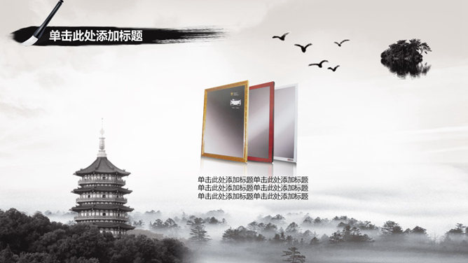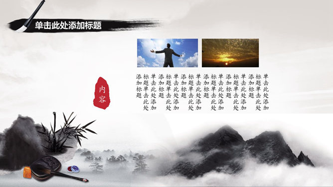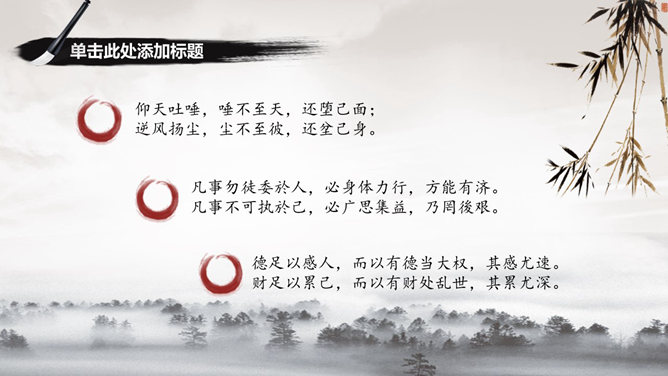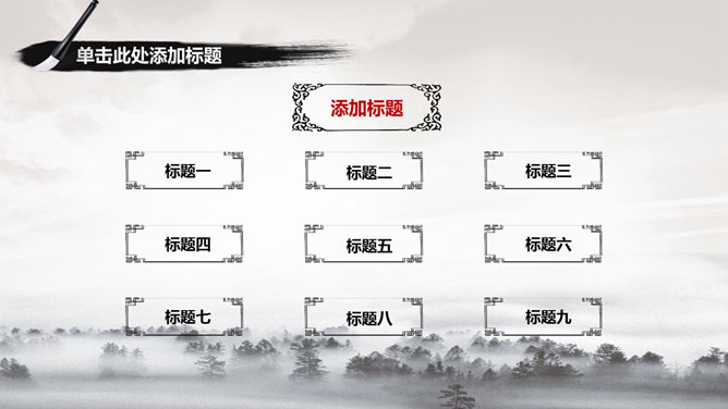典雅古风水墨山水画PPT模板。一份古典水墨中国风幻灯片模板,页面丰富齐全,框架结构完整。