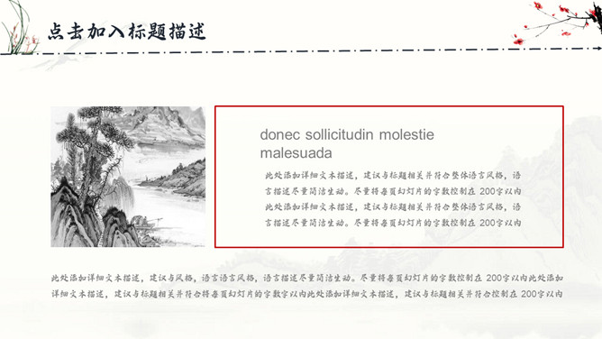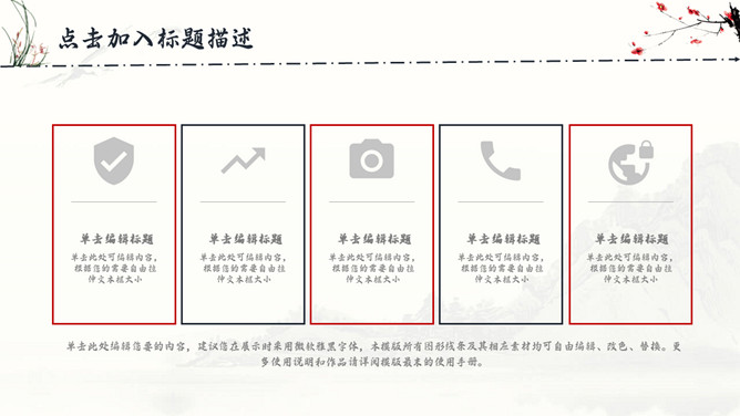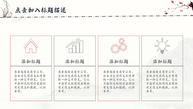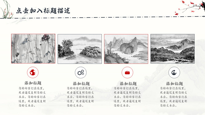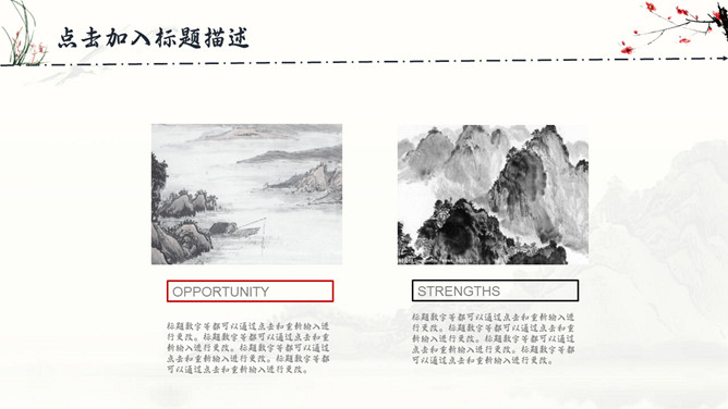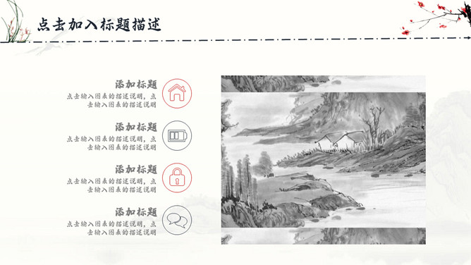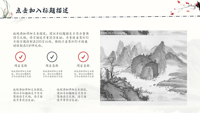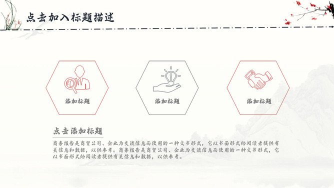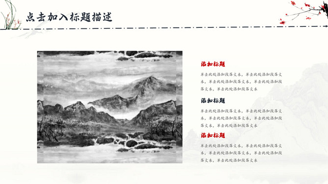 古典水墨国画中国风PPT模板。一套精美中国风模板,水墨山峰、兰花草、梅花装饰,很有古典国画韵味。