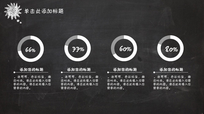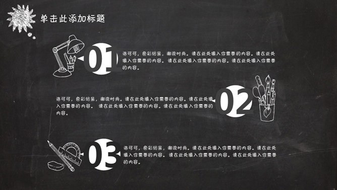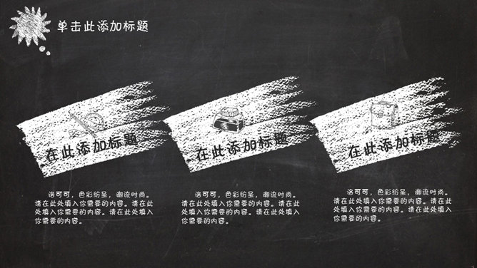 创意卡通黑板粉笔字PPT模板。一份精美创意的幻灯片模板,逼真黑板粉笔字效果设计,建议安装字体: