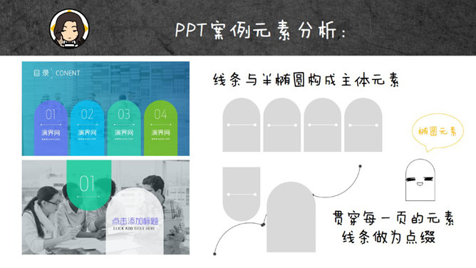 设计元素在PPT中的运用。对于任何一种设计来说,设计元素在设计中都是必须的。没有了设计元素,就好比Iphone没有了Ios,写文章没有了主旨,歌曲没有了旋律。这些对于一个物体来说都是:灵魂!没有了灵魂,我们怎么去突出其个性与差异化呢?下面让我们一起来学学设计元素吧!首先,还是先让我们来看看案例吧,在看案例的过程中,我们要学会分析案例,提取出案例中的设计元素……