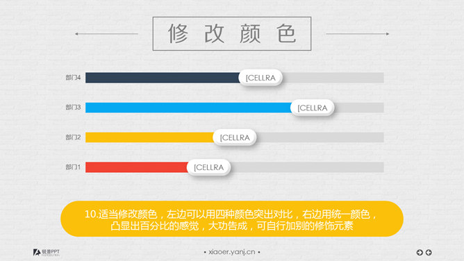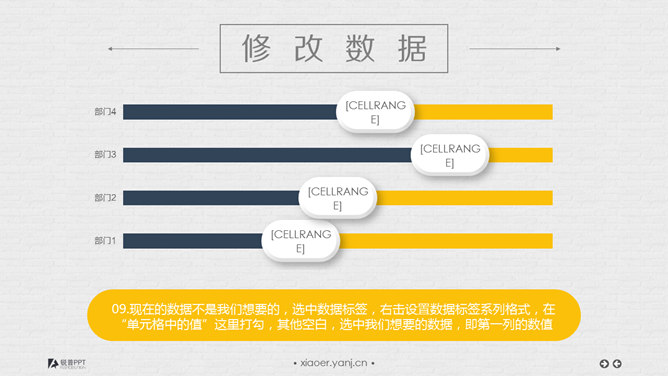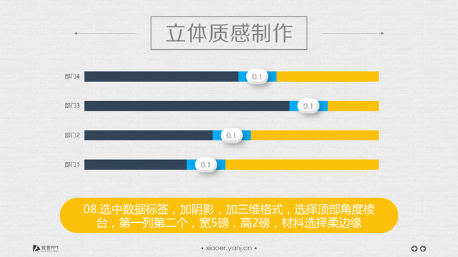 立体按钮条形图表制作教程。步骤:1、插入系统默认的堆积条形图。2、去网格线,去坐标轴,去图例,去标题。3、将数据表更改为如图所示,注意固定列使用的是公式:1-数据填入列,保证了2个相加为1。4、选中蓝色的这一列,点击图表旁边的加号,选中数据标签,修改数字的字体和颜色,以及字号。5、选中数字标签,设置形状格式,填充为白色,无边框,字号颜色适当调整。6、选中数字标签,在软件上方菜单栏找到图表工具,选中格式,然后更改形状为圆角矩形……