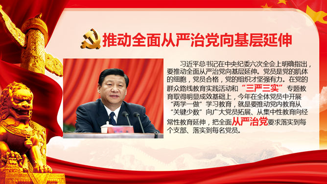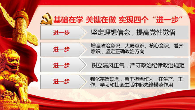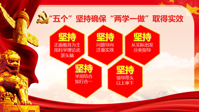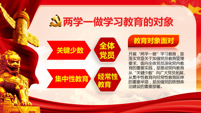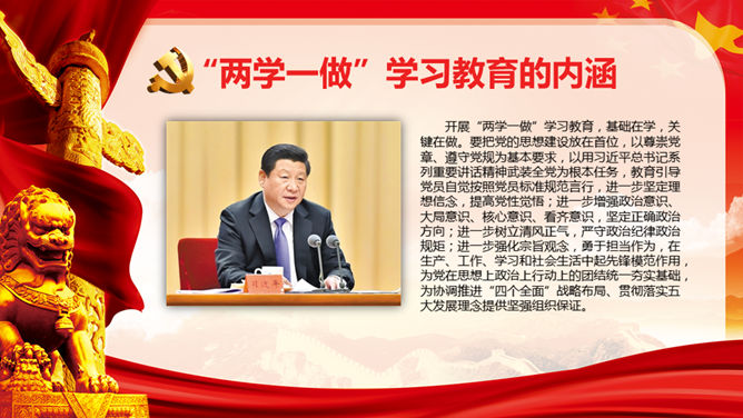 两学一做党课讲稿PPT模板。一份精美实用的两学一做党课讲稿幻灯片模板,围绕着学党章党规,学系列讲话,做合格党员等专题展开,页面丰富,动态效果。