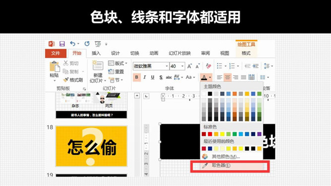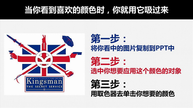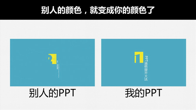 PPT逼格提升大法之配色篇。如图,让我们来感受一下配色的重要性,明白了吗。让我们从最简单的做起。第一招,黑白加一种彩色,选择一个你最喜欢的颜色,配上黑和白,不会让你失望,简洁大气,大面积使用色块更加精彩。想要炫酷感就加上一个黑白的应景底图,如果你学会了调整颜色的透明度的话,那PPT简直就非常非常饱满了。第二招,天生没有审美,那就去模仿,当你看到一张顺眼的图片,就把它的颜色偷过来……