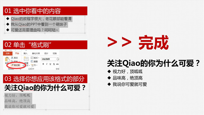 一分钟学会使用PPT格式刷。今天要在一分钟之内学会的是【格式刷】,抄袭、借鉴的最好帮手。官方的解释是:喜欢特定所选的内容的外观?您可以向文档中的其他内容应用该外观。