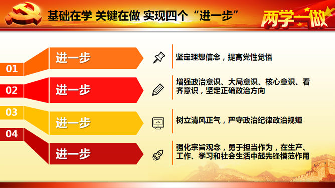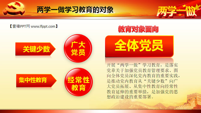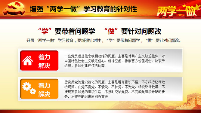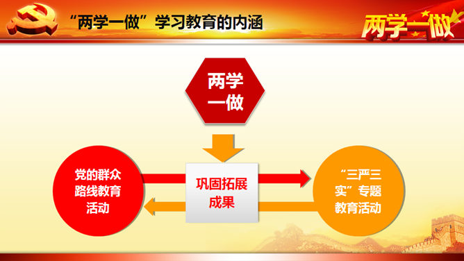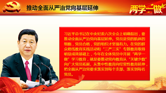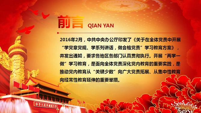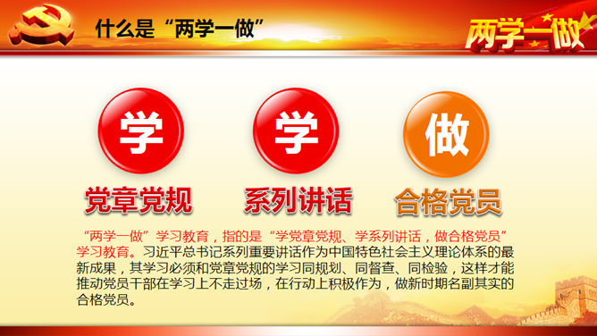 两学一做汇报报告PPT模板。一份两学一做主题报告汇报幻灯片模板,大方精美实用,页面丰富,框架结构完整。