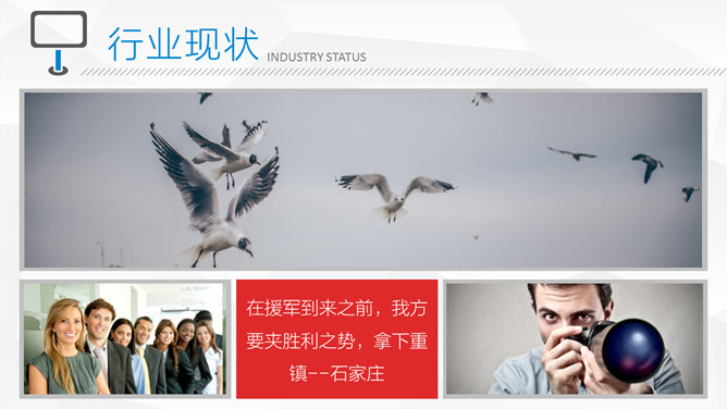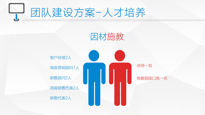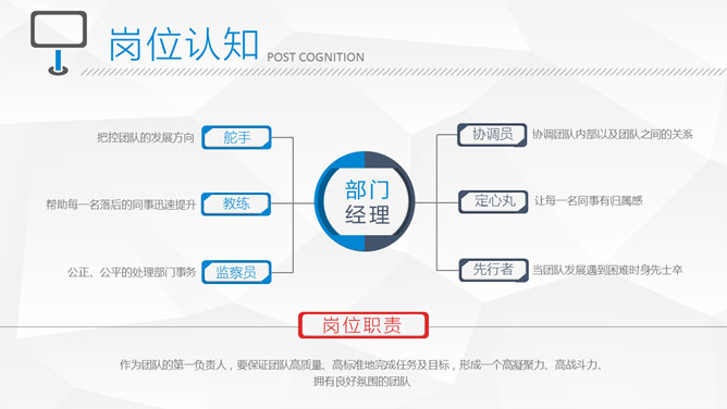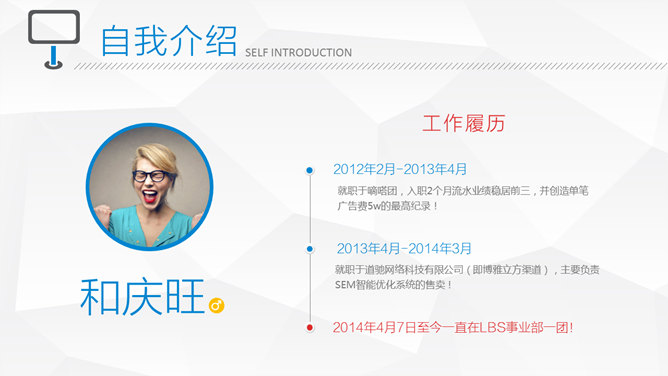 竞聘演讲述职报告PPT模板。一份简洁时尚的述职报告竞聘演讲幻灯片模板,清新蓝红配色,低面多边形背景,个人情况简介、岗位认识、行业现状、团队建设、遇到问题和解决方案等部分。