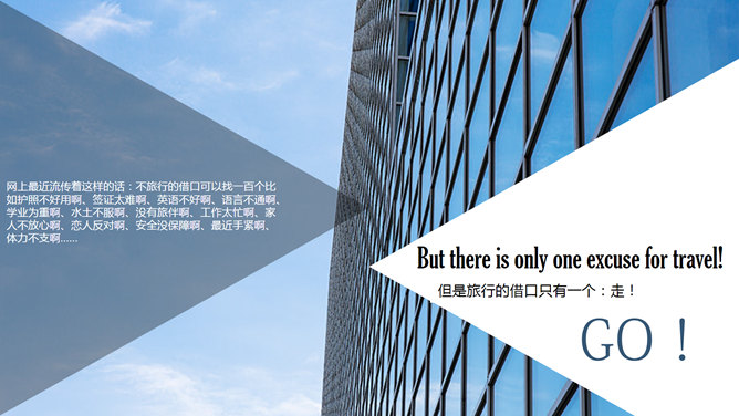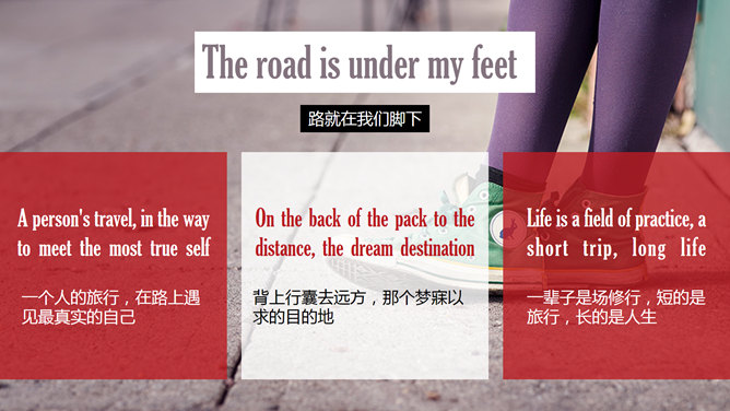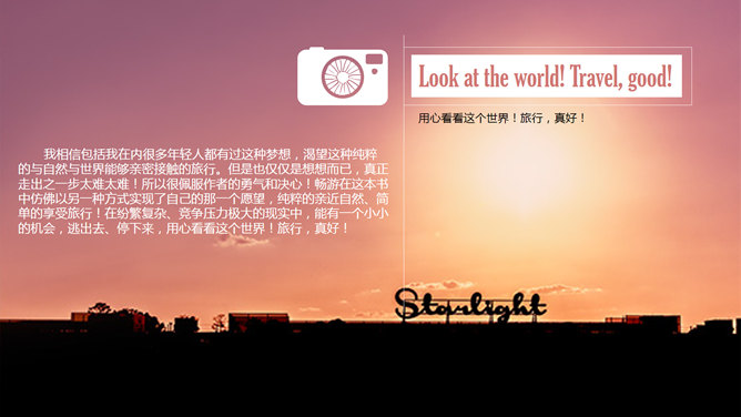 旅行的意义杂志风PPT模板。一款大图排版杂志风幻灯片模板,介绍旅行的意义,使用英文字体:Gloucester MT Extra Condensed。