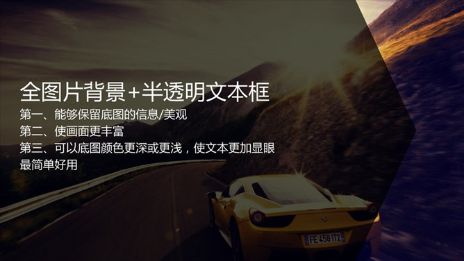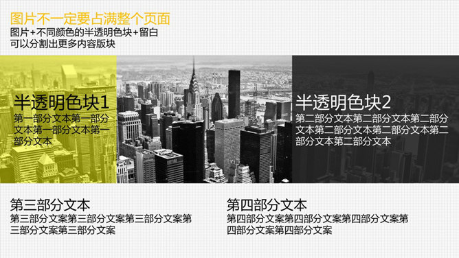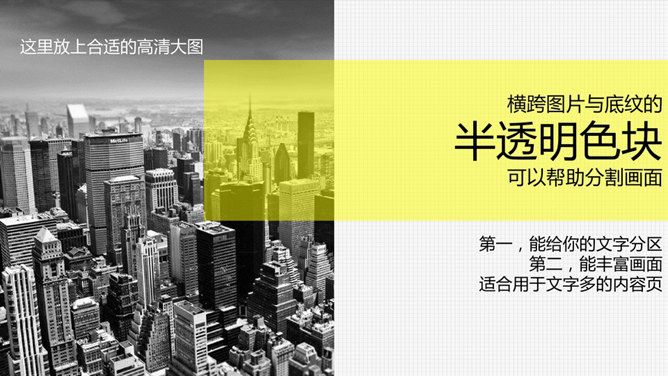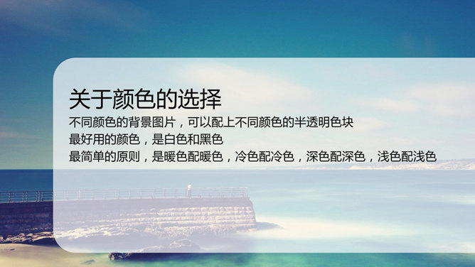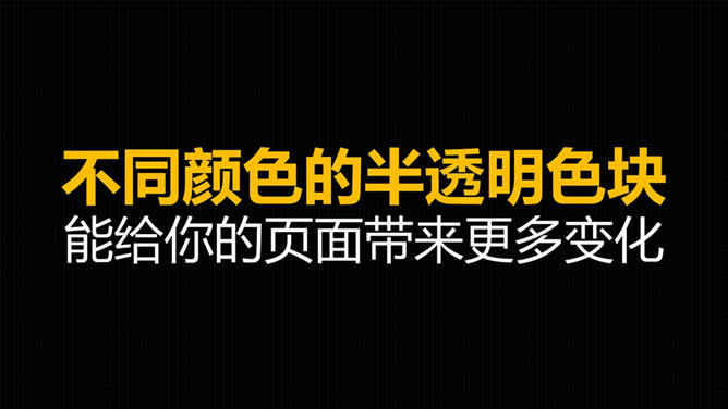 PPT逼格提升大法之半透明色块。如果你学会了调整颜色的透明度的话,那PPT简直就非常饱满了。一言蔽之,高端、大气、上档次。那么如何应用呢?第一式,轻松打造杂志风风格,如下图是近年来比较流行的杂志风风格,一大诀窍就是高清大图加半透明色块,比如,图片背景加局部半透明色块最适合封面和过渡页,内容页最简单的是半透明文本框……