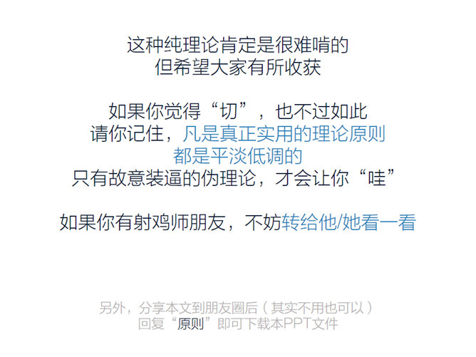 设计六原则在PPT设计中的应用。在外网看到一篇关于设计原则的文章,这篇文章第一句话就非常大口气,用它原来的话就是“一份设计如何,就看设计者在设计过程中怎么去应用这六个原则”,就是这句话让我有兴趣让我继续看下去,看完之后感觉有一定的收获,鉴于我发的实战类文章比较多,理论类的文章却是比较少的,而设计理论恰是帮助提高射鸡师的设计水平,突破瓶颈的最强激素,所以我专门去翻译了一下(翻译的同时加入了自己的理解)这六大原则和它的实现方法,并分享给大家……