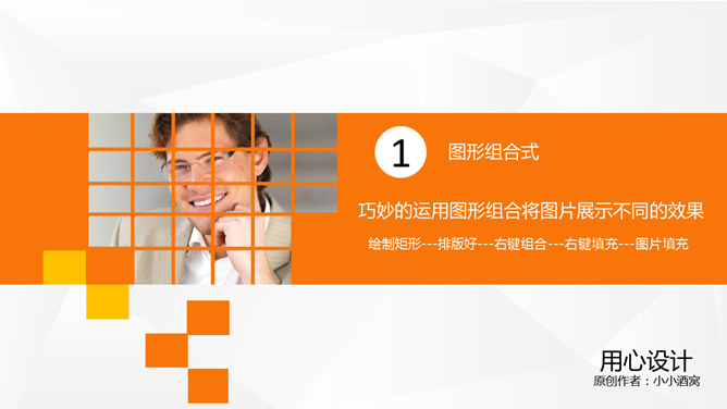 PPT图片高级运用简易快速上手教程(2)。在教程1中讲解了有关图片直接填充形状中形成不一样的风格图片,摆脱常规的矩形,本节教程旨在图形填充的基础上介绍更进一步的图形展示方法。巧妙的运用图形组合将图片展示不同的效果,绘制矩形---排版好---右键组合---右键填充---图片填充……