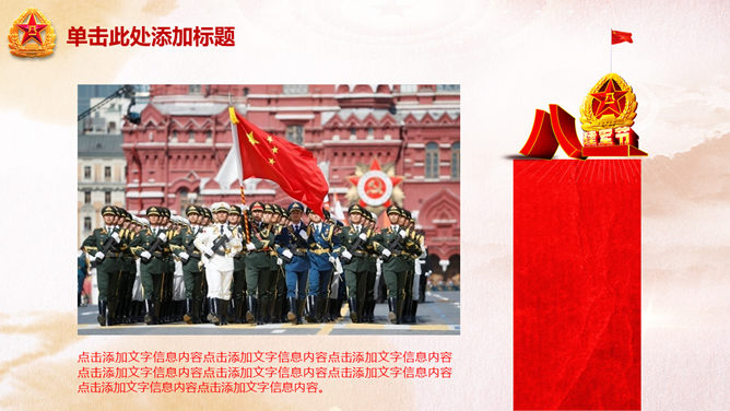 庆祝八一建军节PPT模板。一份用于庆祝八一建军节的幻灯片模板,以恢弘大气的天安门城楼为背景设计。