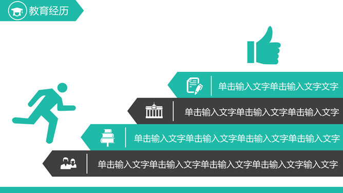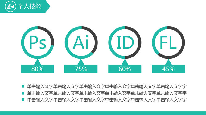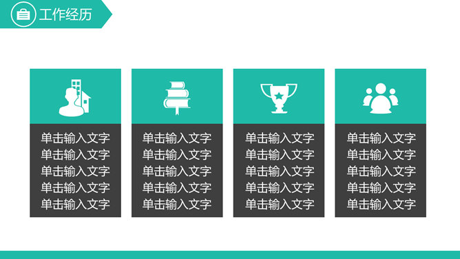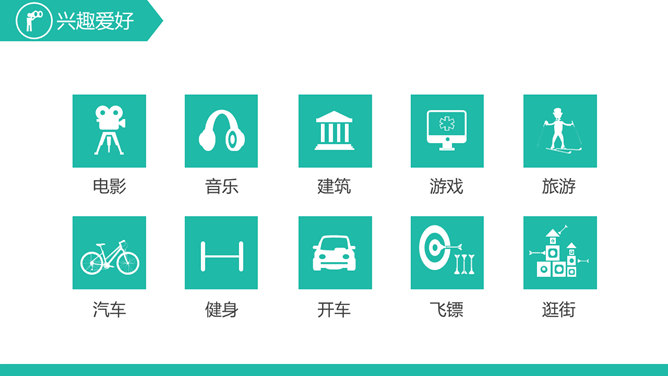 。一套个人简历幻灯片模板,简约扁平化设计风格,框架完整,包括基本情况、个人技能、教育经历、工作经历、个人荣誉、兴趣爱好等部分。