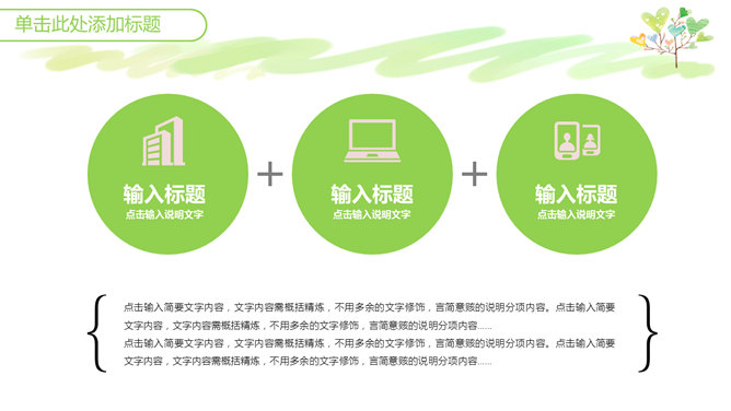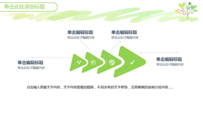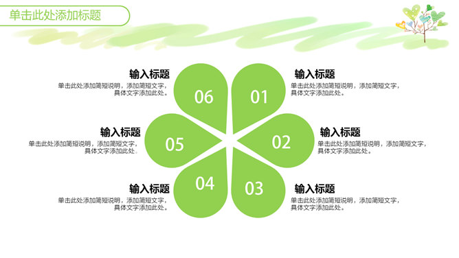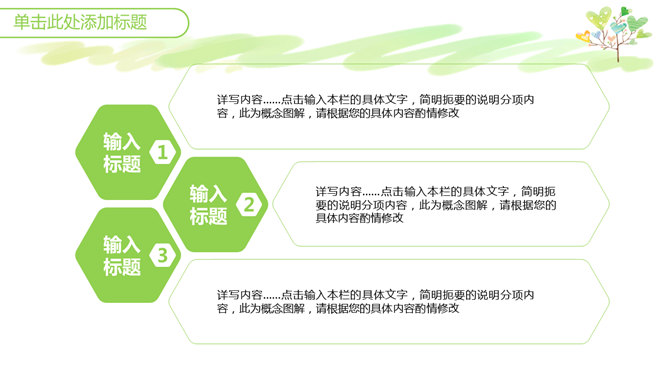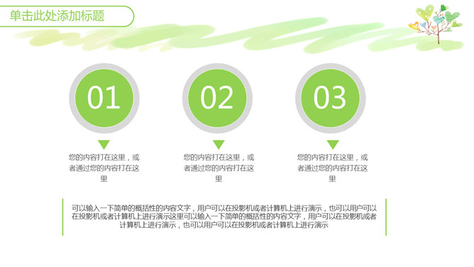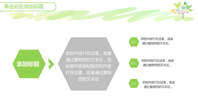可爱小清新心形小树PPT模板。一套小清新幻灯片模板,绿色主色调,可爱卡通心形小树背景,适合教学课件使用。