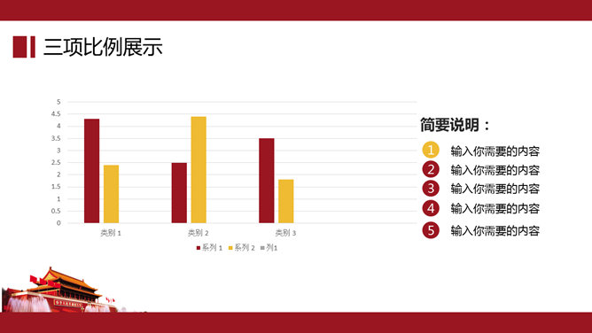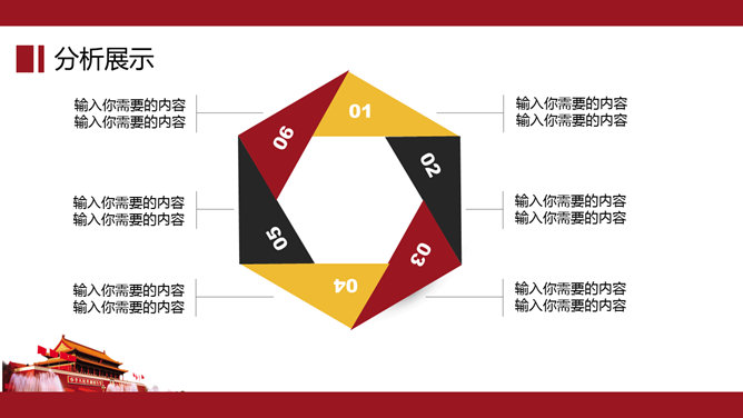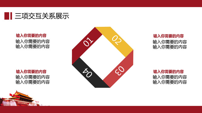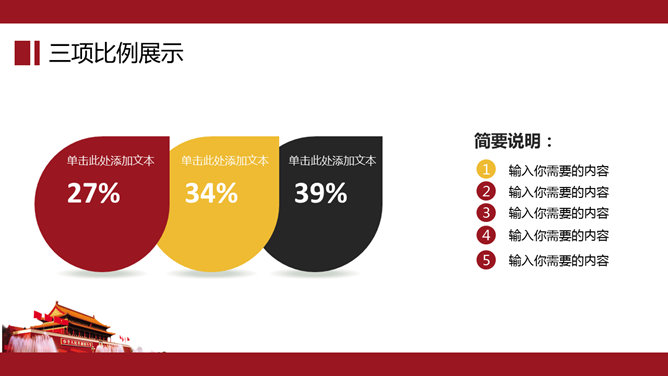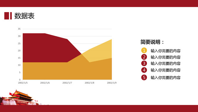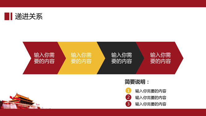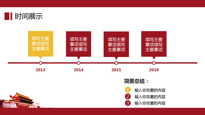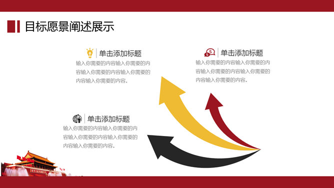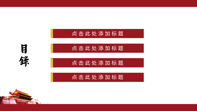 大气天安门党政通用PPT模板。一套党政相关工作汇报幻灯片模板,以恢弘大气的天安门城楼为背景。建议安装字体:
