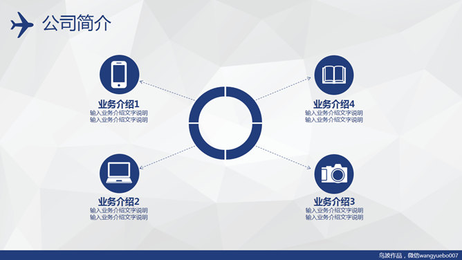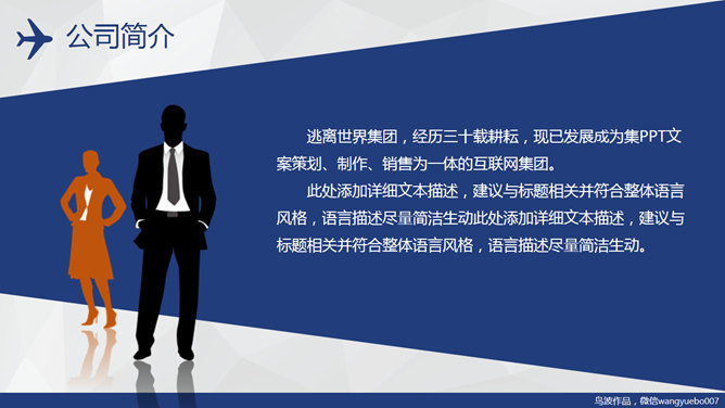 大气飞机公司企业介绍PPT模板。一套实用的企业宣传公司介绍幻灯片模板,采用飞机为主元素设计,象征着一飞冲天。
