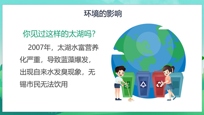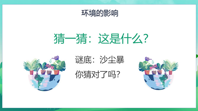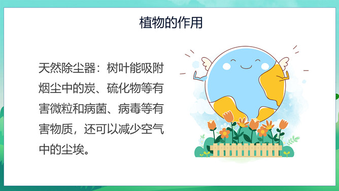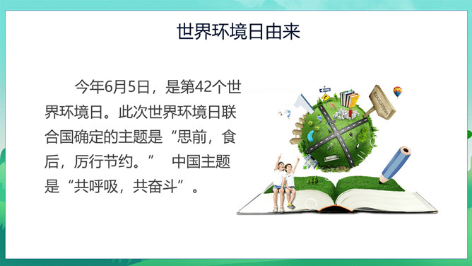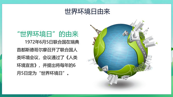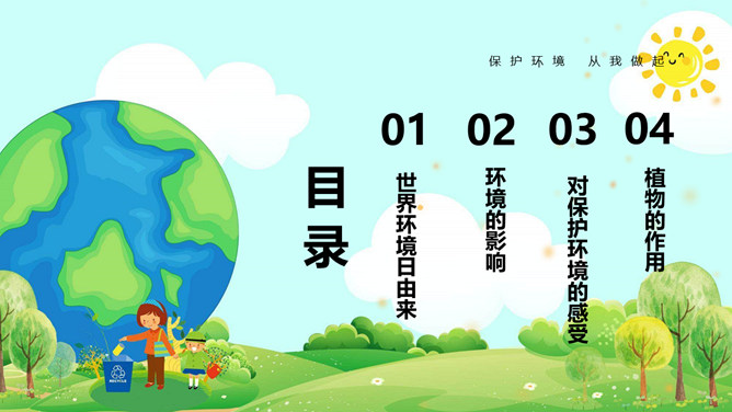 6月5日世界环境日PPT模板。内容包括世界环境日由来、环境的影响、对保护环境的感受和植物的作用。