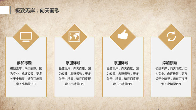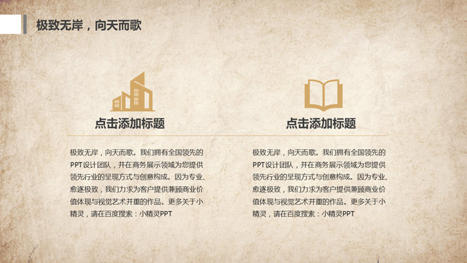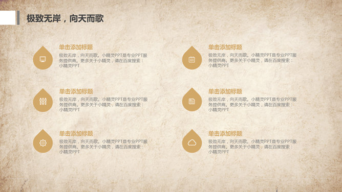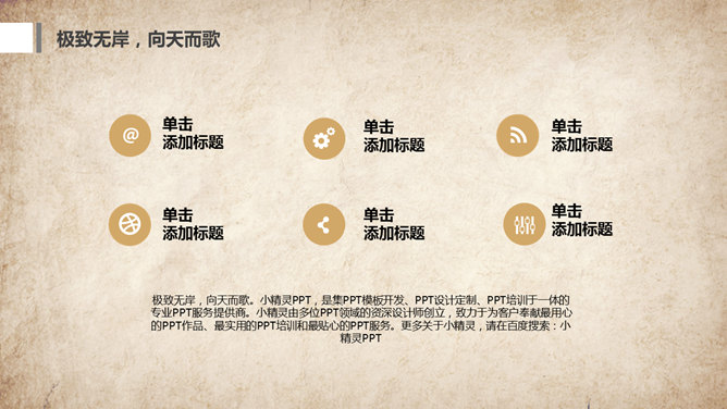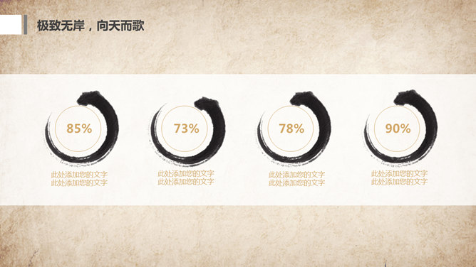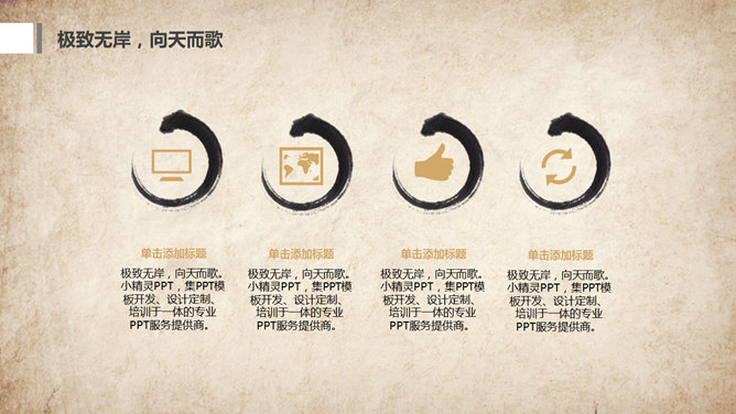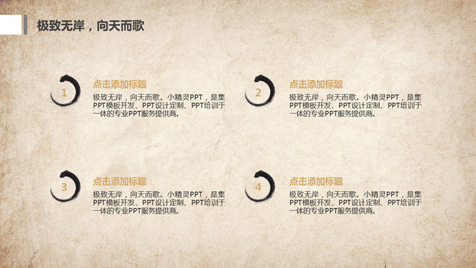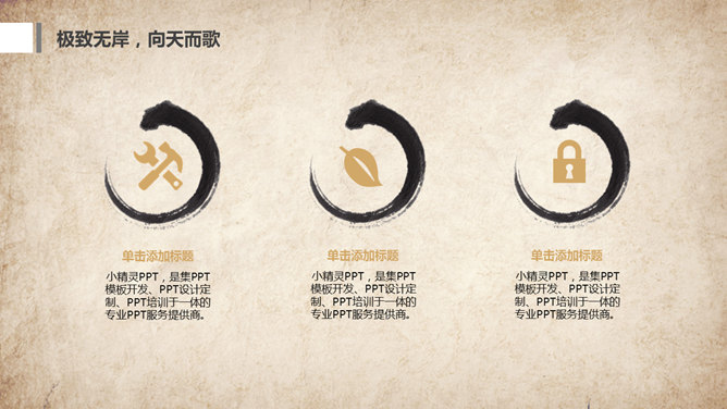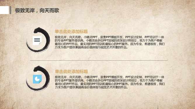 水墨做旧古典中国风PPT模板。一套古典中国风幻灯片模板,复古做旧纸质背景,水墨效果设计。使用字体:方正舒体。