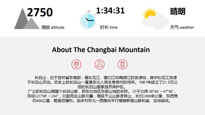 长白山旅游行程景点介绍PPT模板。一套用于介绍长白山旅游景点介绍、行程安排的幻灯片模板,用于其他旅游目的地稍作修改即可。