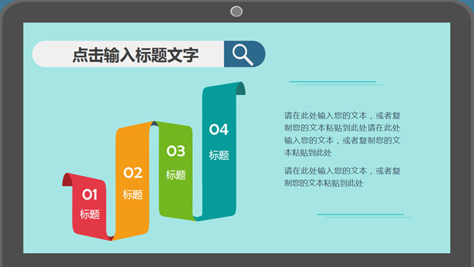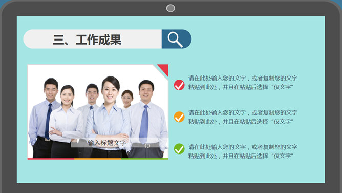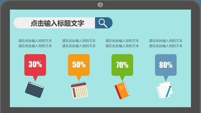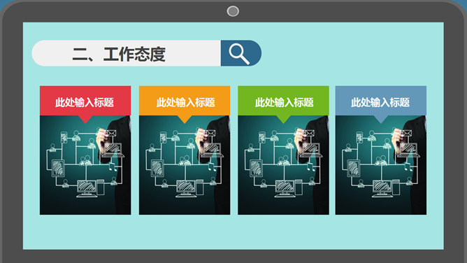 扁平化个人述职报告PPT模板。一套实用的个人述职报告幻灯片模板,扁平化设计风格,彩色配色,包括工作回顾、工作态度、工作成果、未来展望几个部分。