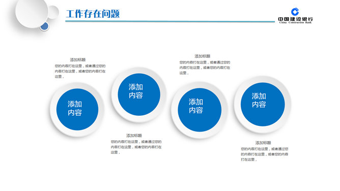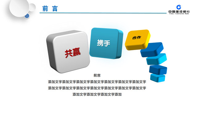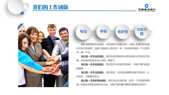 精美建行年终汇报总结PPT模板。一套适合中国建设银行员工年终总结汇报使用的幻灯片模板,微粒体设计风格,页面丰富实用,动态效果。建议安装字体: