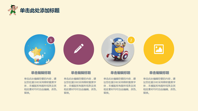 可爱卡通儿童教育教学PPT模板。一套适合幼儿园、小学教学使用的幻灯片模板,以各种卡通人物设计,非常可爱。