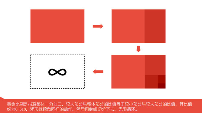 精品详细实用PPT排版教程。为啥我做的PPT看起来杂乱无章。那还不好办?!今天我们就好好聊一聊“排版”。首先让我们先了解一下黄金比例,黄金比例是指将整体一分为二,较大部分与整体部分的比值等于较小部分与较大部分的比值,其比值约为0.618,矩形继续做同样的动作,然后再继续切分下去,无限循环。这个数值的作用体现在诸如绘画、雕塑、音乐、建筑等艺术领域。说了那么多,平衡很重要,而每门设计领域又都有互相学习借鉴的地方……