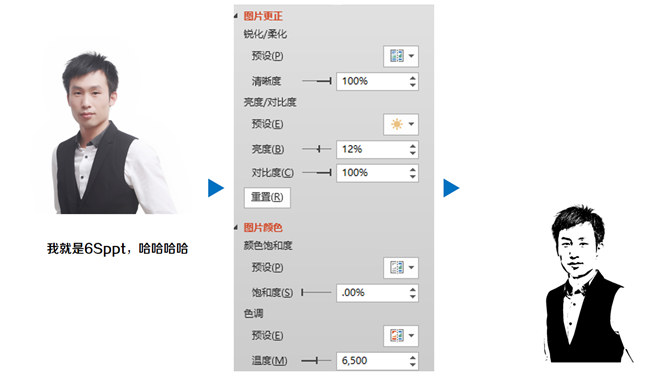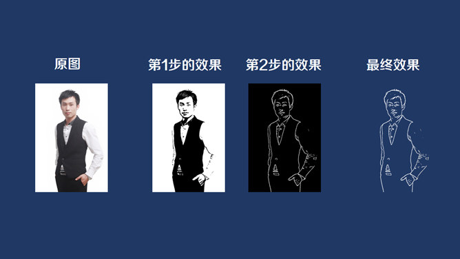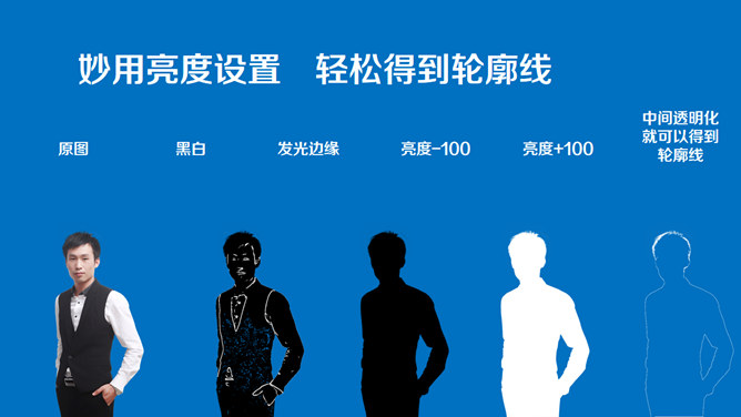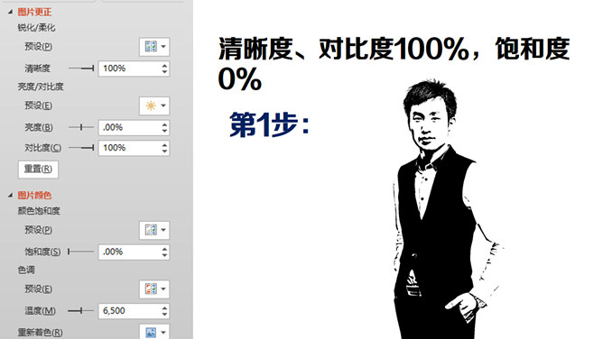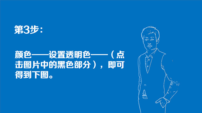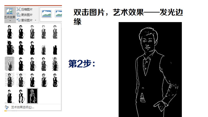 创意图片透视效果制作PPT教程。PPT之PS透明法,白色轮廓线条图,第1步:清晰度、对比度100%,饱和度0%。第2步:双击图片,艺术效果—发光边缘。第3步:颜色—设置透明色—(点击图片中的黑色部分),即可得到下图。