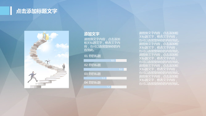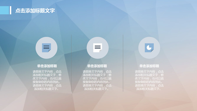 淡雅低面多边形背景PPT模板。一套多用途通用幻灯片模板,低面多边形图片背景,半透明形状元素,淡雅简洁。