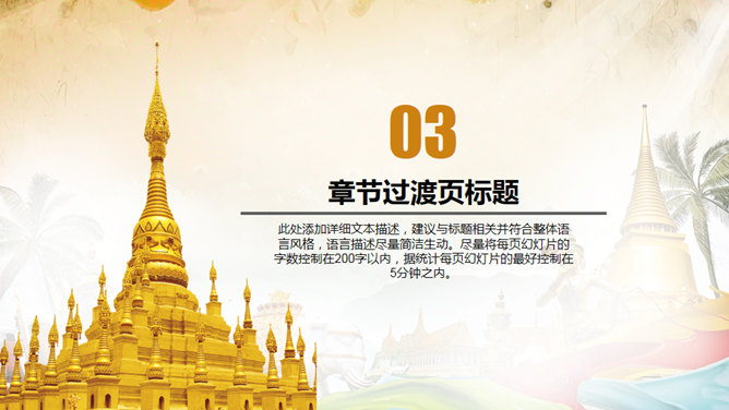 泰国文化泰国旅游PPT模板。采用泰国风格的设计元素制作,适合介绍泰国文化,泰国旅游胜地景点等。