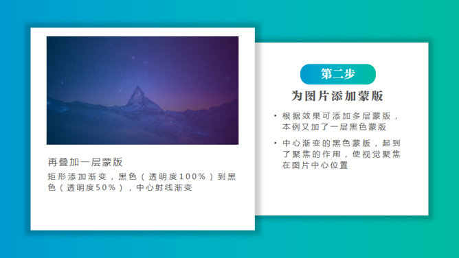 四步轻松打造唯美IOS风渐变PPT背景。第一步:寻找合适的图片。何为合适?符合PPT的主题性质,符合行业性质,考虑使用场景。第二步:为图片添加蒙版。画一个矩形覆盖在图片上,调整颜色设置透明度。颜色可选择纯色、同色系、双色系或多色系(慎用)作渐变处理。第三步:添加形状和主体文字。第四步:添加元素美化。