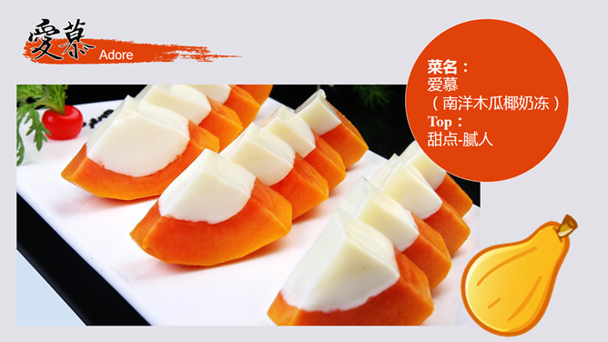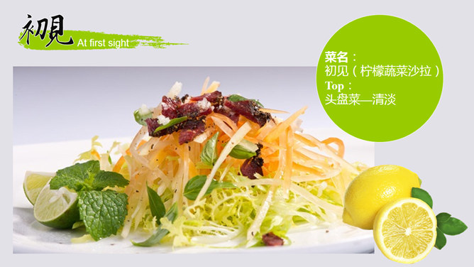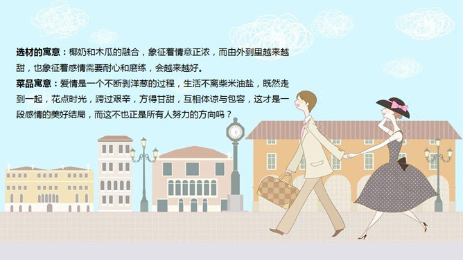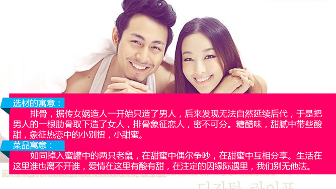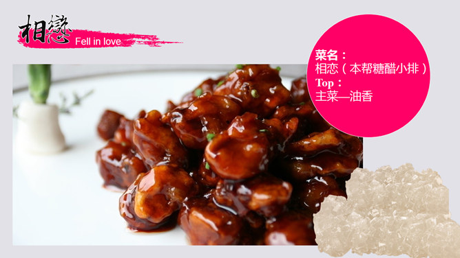 小资情调菜品介绍PPT模板。一份小清新餐馆菜品介绍幻灯片模板,有配图菜名、选材的寓意、菜品寓意等页面。