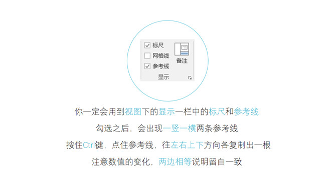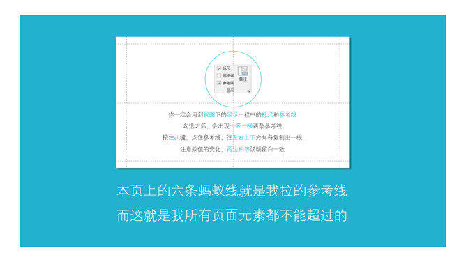 教你三分钟搞定PPT内页教程。是时候入版心的概念了,版心是页面中主要内容的所在区域,其实就是每一页PPT作过程中留出适当的上下左右边距,怎么留,看情况吧……比如,这一页的版心就是我的蓝色色块区域,你一定会用到视图下的显示一栏中的标尺和参考线,勾选之后,会出现一竖一横两条参考线……