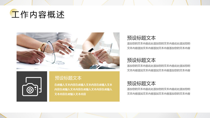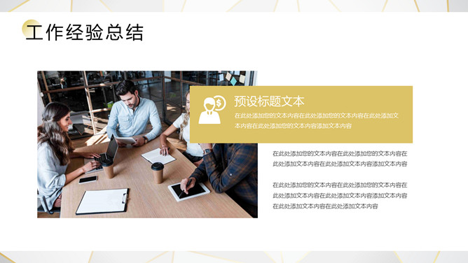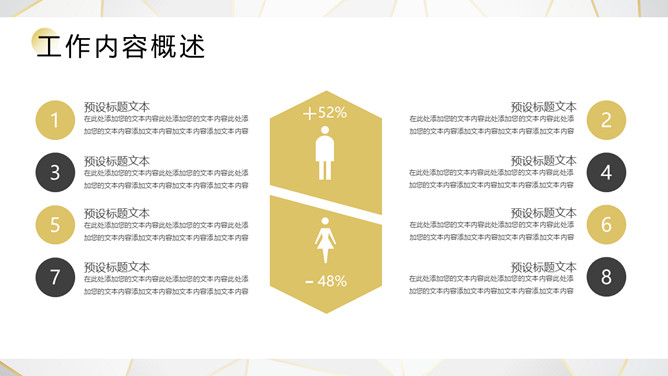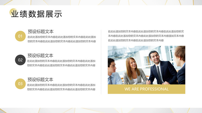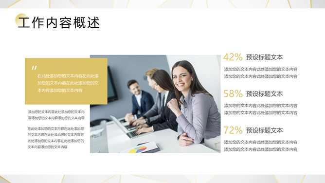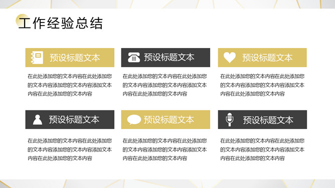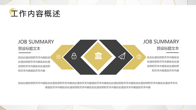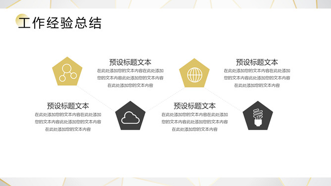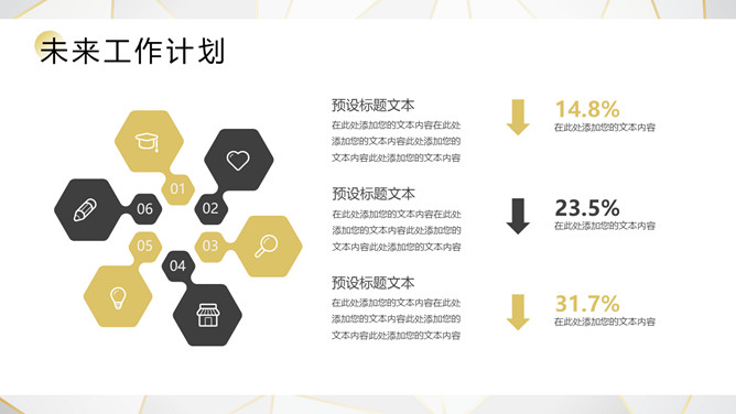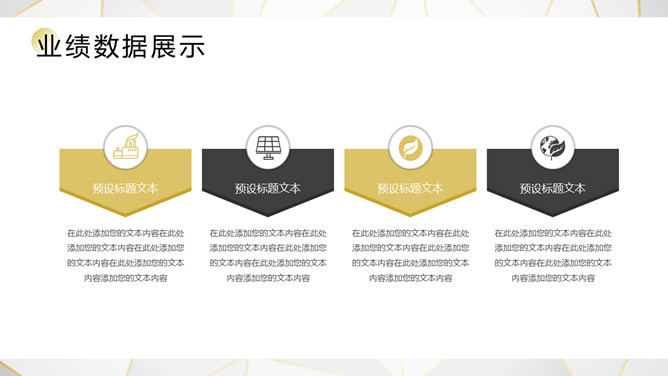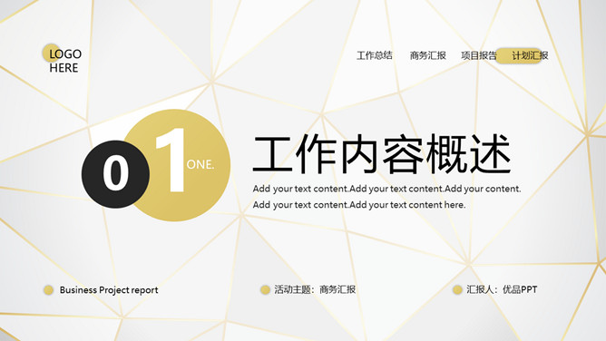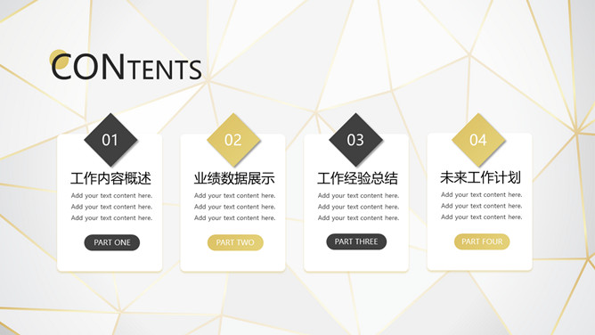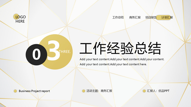 黑金季度项目工作总结PPT模板。一套季度工作总结汇报模板,金色网状三角形背景,经典黑金配色,适合项目汇报。