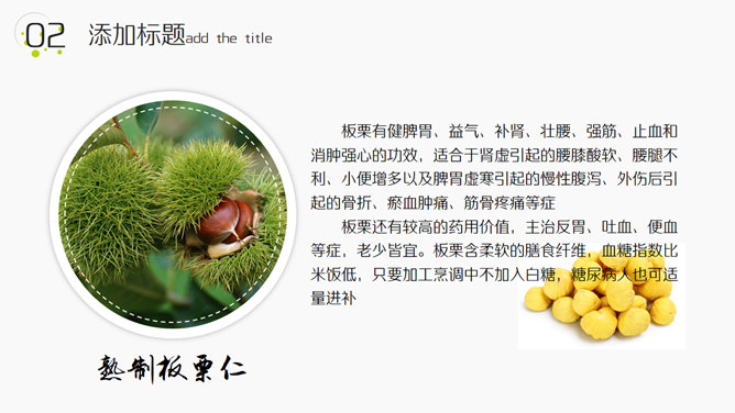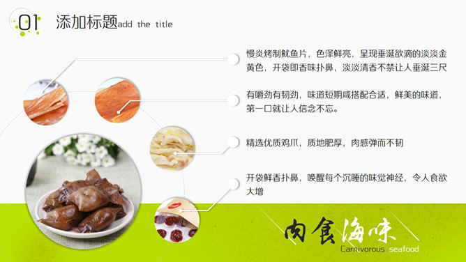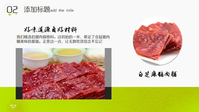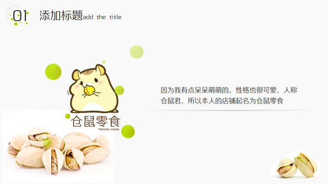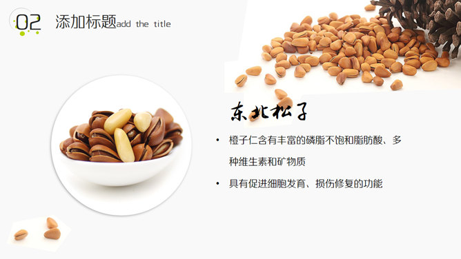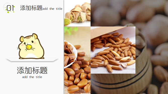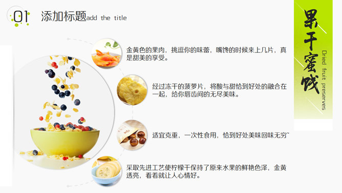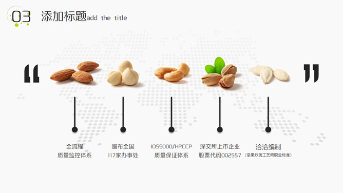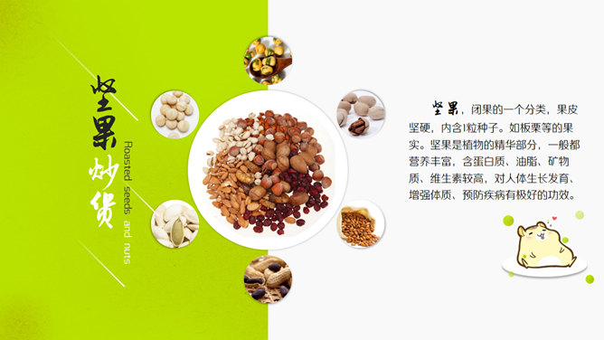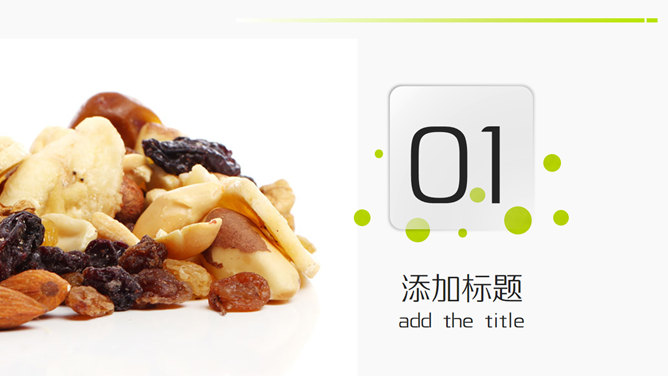 坚果零食小食品展示PPT模板。一套食品坚果炒货零食产品展示幻灯片模板,框架结构完善,以图文排版为主。使用字体: