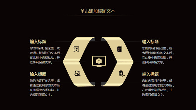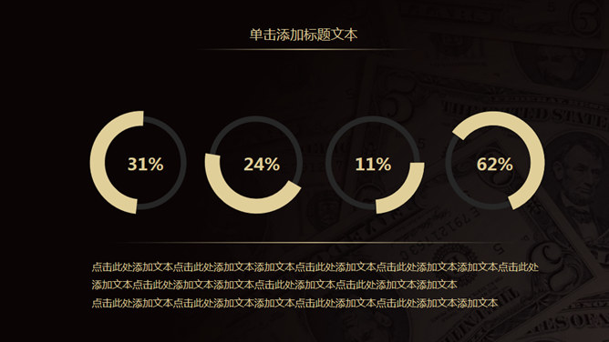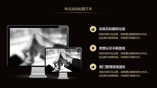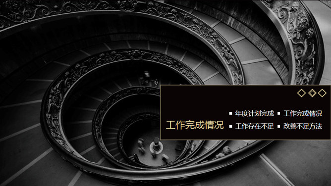 高端黑金工作总结计划PPT模板。一套年终工作总结暨工作计划幻灯片模板,高端大气黑金配色,页面丰富实用,框架结构完整,动态演示效果。
