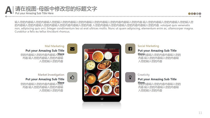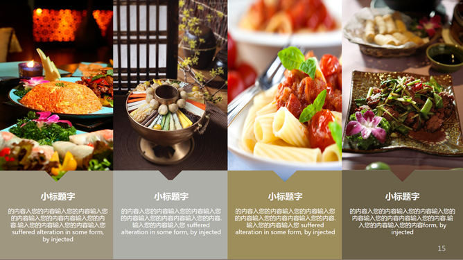 中国味道餐饮美食PPT模板。一套美食展示幻灯片模板,图文排版为主,适合餐厅宣传、美食文化宣讲介绍等用途。