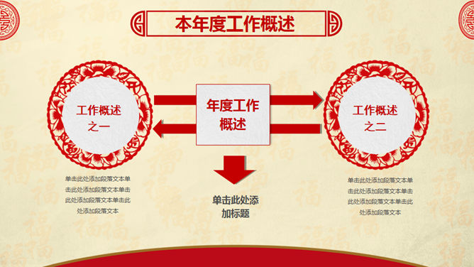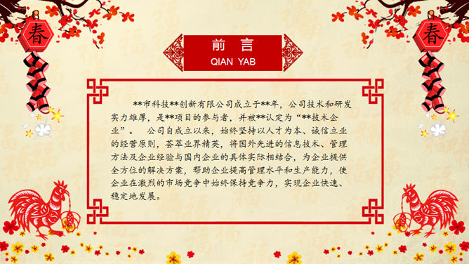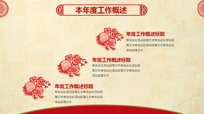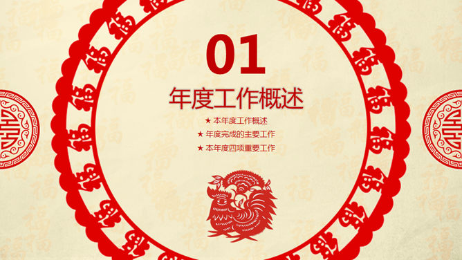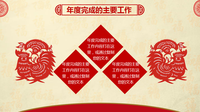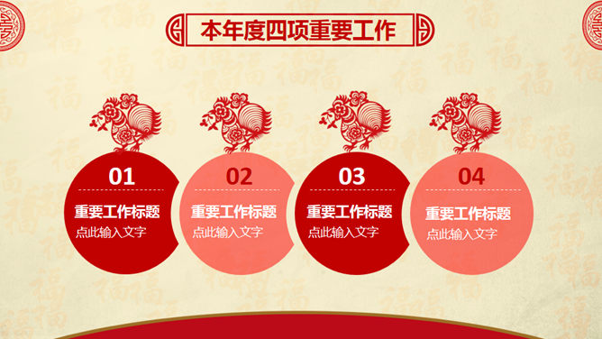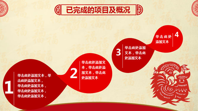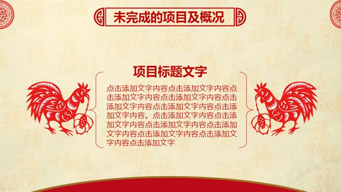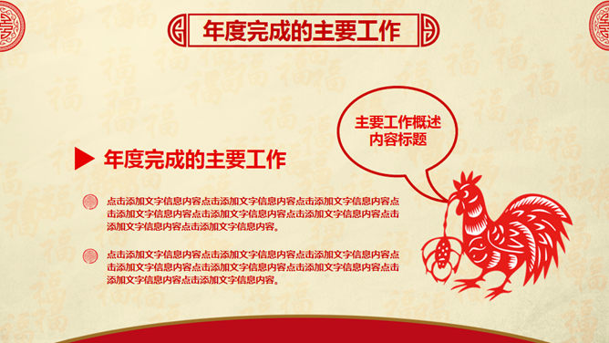 喜庆红色剪纸鸡年主题PPT模板。一套鸡年主题幻灯片模板,喜庆红色剪纸设计,页面丰富实用,框架结构完整。