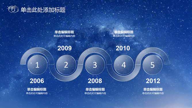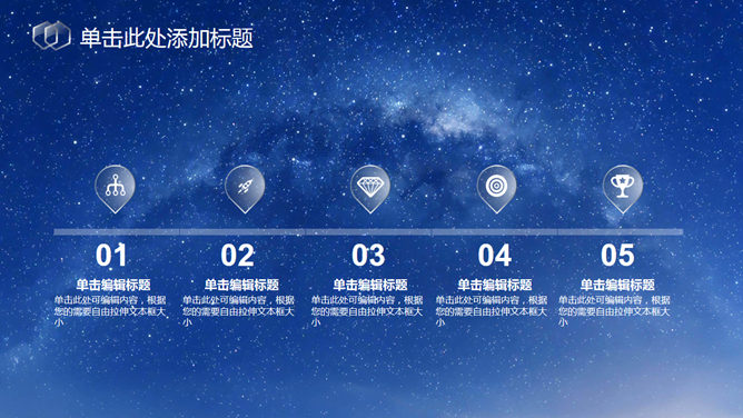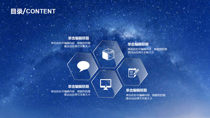 蓝色星空透明玻璃水晶PPT模板。一套IOS风幻灯片模板,蓝色星空背景,透明玻璃水晶效果形状元素设计。