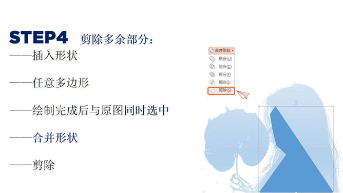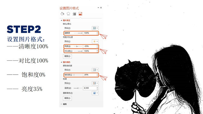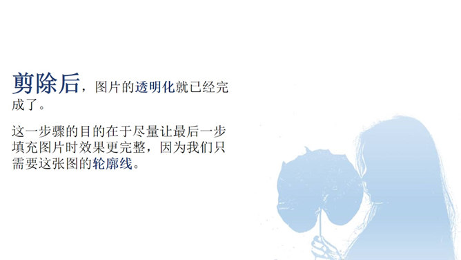 图片透明化处理PPT教程。步骤:1、选择一张文艺点的图片,背景色简单偏白最好。2、设置图片格式,清晰度100%、对比度100%、饱和度0%、亮度35%。3、执行透明化处理,颜色-设置透明色-鼠标点击图片黑色部分。4、剪除多余部分:插入形状,任意多边形,绘制完成后与原图同时选中,合并形状,剪除。5、最后插入想要的图片置于底层。