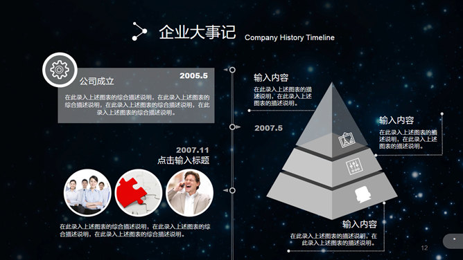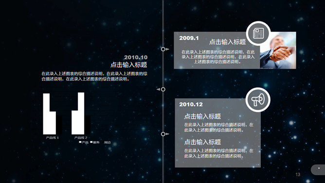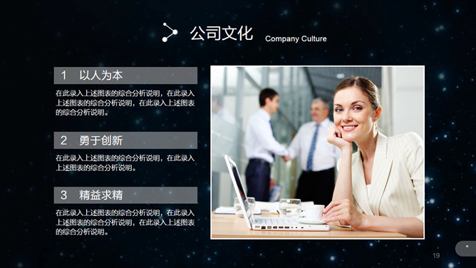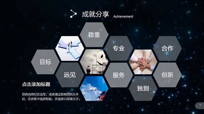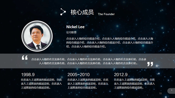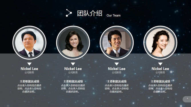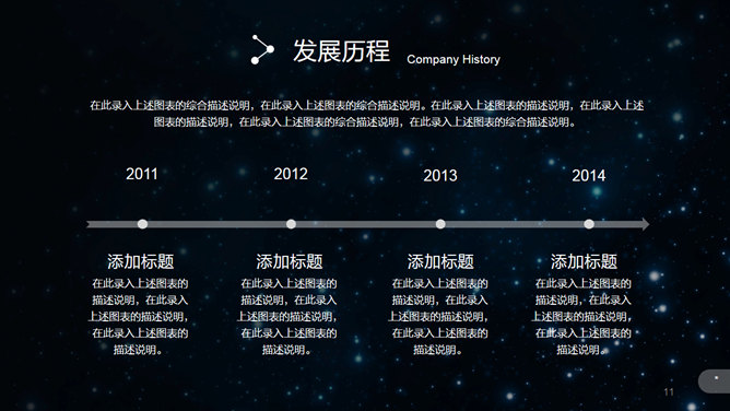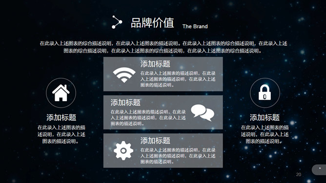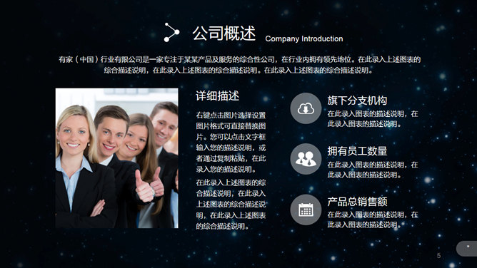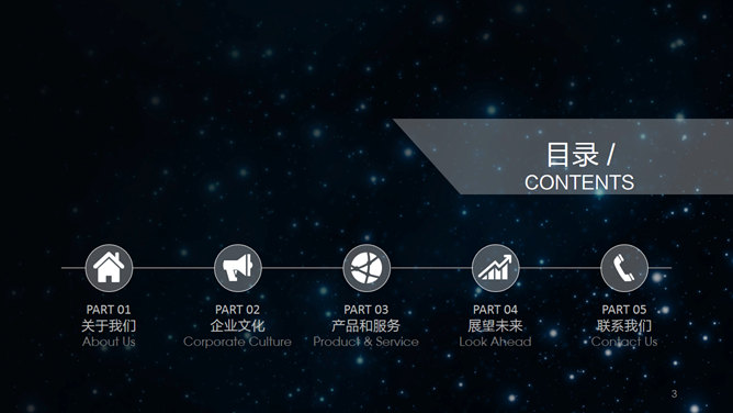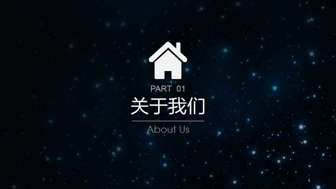 璀璨星空企业介绍宣传PPT模板。一套公司介绍企业宣传幻灯片模板,星空背景IOS风设计,共51页,页面丰富实用,框架结构完整。注意安装字体: