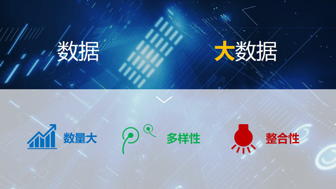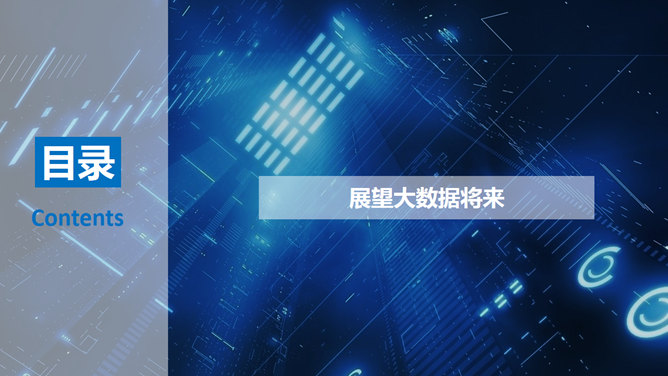 科技感互联网大数据PPT模板。一套互联网大数据主题相关的幻灯片模板,采用蓝色荧光科幻数据中心背景图片,适合互联网大数据分析介绍等用途。
